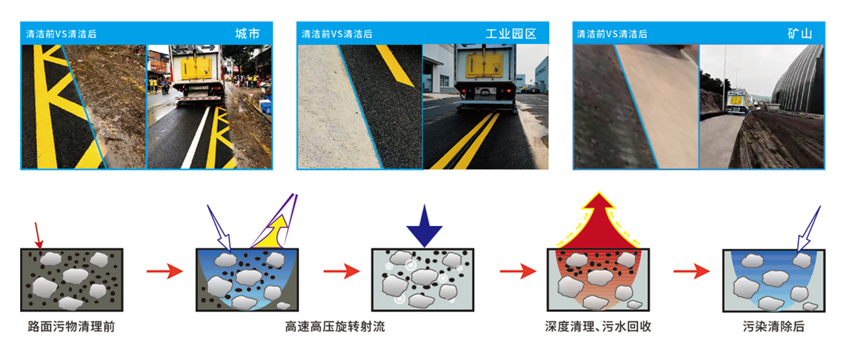 路面清洁效果突出,可完全,彻底清除道路积垢、淤泥、油污、重金属,无污水残留与外泄,有效降低城市道路扬尘、PM2.5、PM10,作业性能处于国际领先水平。