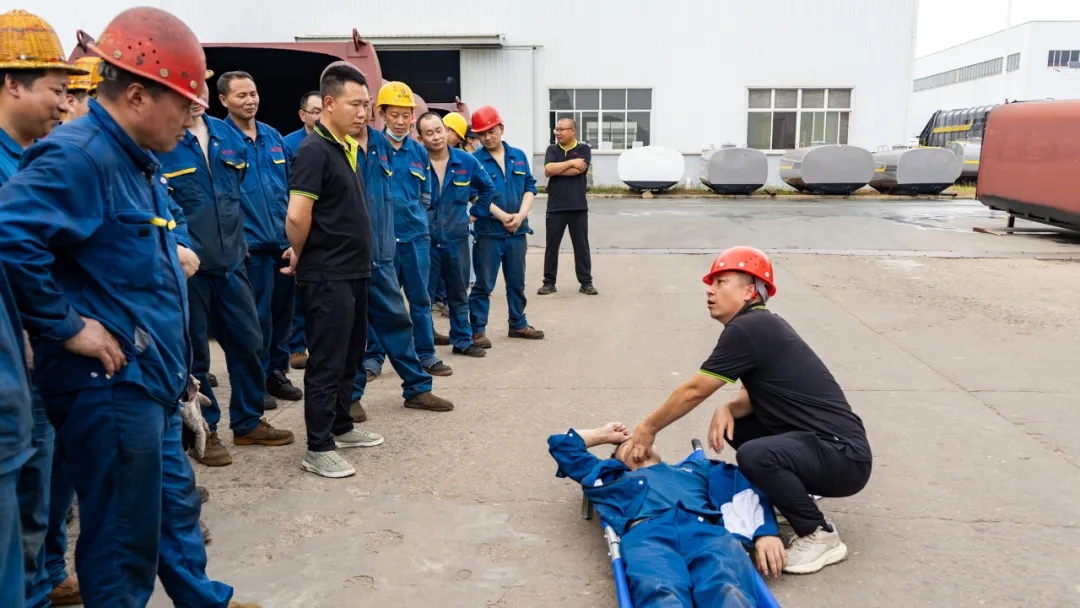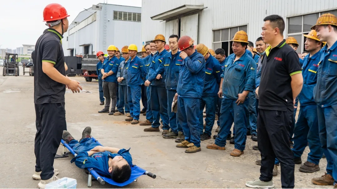 此次演练模拟了车间一线工人在作业过程时中暑晕倒,经现场工友发现后,立即通知班组长,班组长接到险情后迅速启动应急预案,抢险救援组立即赶往事发位置,将中暑人员转移至安全地带,经过人工物理降温、喂服防暑药品等紧急处置,现场中暑人员逐步恢复意识,脱离危险,并通知救护车送往就近医院接受救治的全过程。